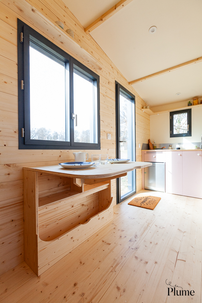 Coté architecture, le projet conserve toujours son côté simple, droit au but mais néanmoins chaleureux et accueillant. Rappelons que le cahier des charges de notre tiny house standard repose sur la volonté de proposer une expérience atypique et dépaysante à un tarif maîtrisé. La tiny house permettra d’accueillir un couple de voyageurs avec ou sans enfant sur plusieurs jours. Ils pourront dormir, faire la sieste, cuisiner, manger et se laver dans une petite maison en bois, au matériaux chaleureux au couleurs douces et issue d’un atelier artisanal français.